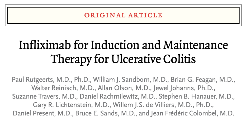 Rutgeerts P, Sandborn WJ, Feagan BG, et al. Infliximab for Induction and Maintenance Therapy for Ulcerative Colitis.